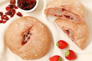 いちご100%のパウダーを練りこんだブール生地で、白あんとドライクランベリーを包んで焼き上げました。